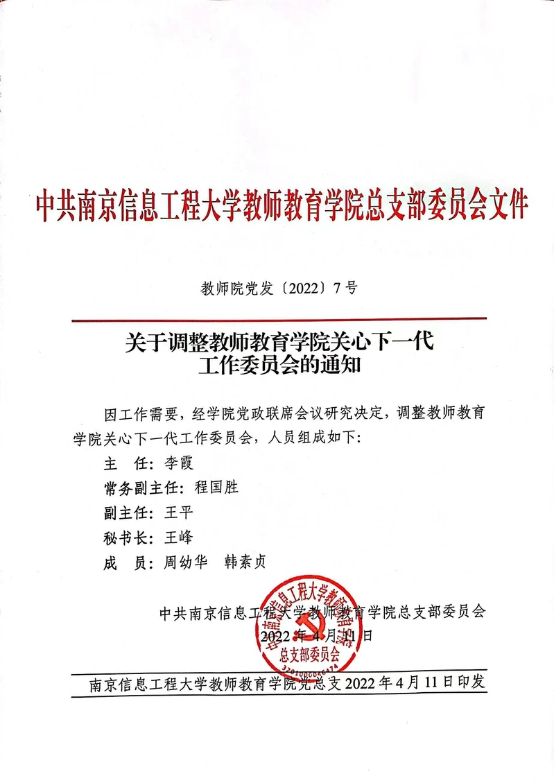 【教师院党发〔2022〕7号】关于调整教师教育学院关心下一代工作委员会的通知