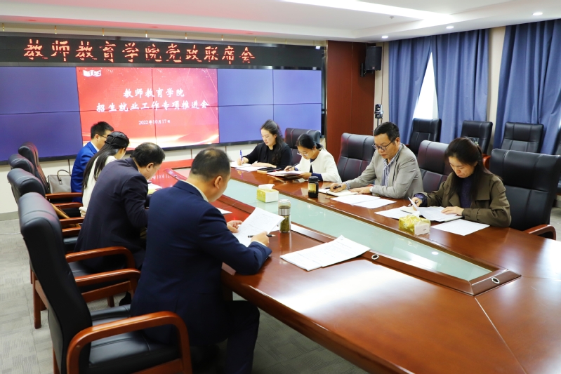 王平副书记首先汇报了近年来学院招生包干地区中学上线生源及录取情况,对2022年的招生录取数据进行分析解读,并就进一步改进招生工作提出相关具体措施。毕业班辅导员刘影对就业工作具体推进情况做了汇报,并就学院2019级学生考研、出国(境)、考公考编的具体数据及考研报名的校内外及专业分布做了分析。