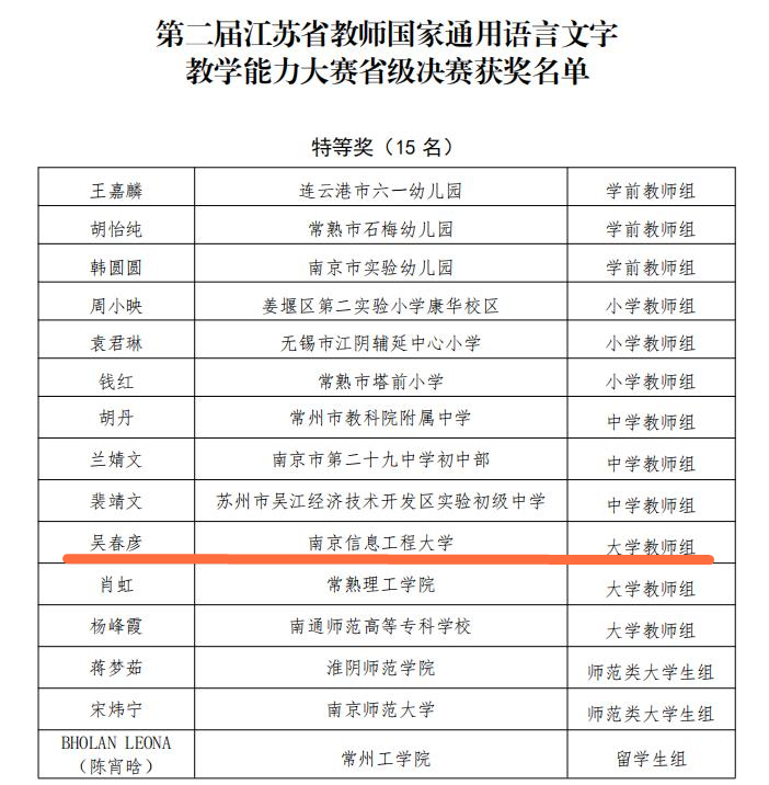 10月30日,历时两天的第二届江苏省教师国家通用语言文字教学能力大赛决赛落下帷幕。全省37家单位的145名选手,分学前教师组、小学教师组、中学教师组、大学教师组、师范类大学生组和留学生组五个组别参加了决赛。我校教师教育学院教师吴春彦老师和学生杨许帅、张欣娜、王静,分别获得大学教师组特等奖和师范类大学生组二等奖。