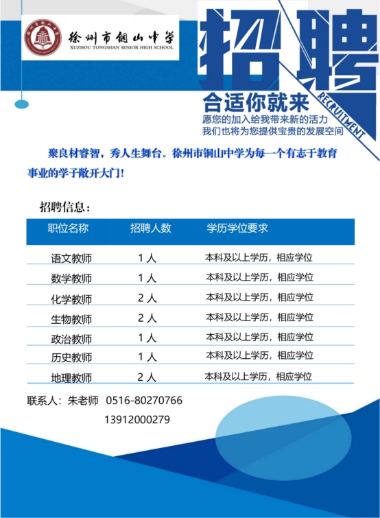 【招聘信息】江苏省徐州市铜山中学2024年公开招聘教师岗位公告