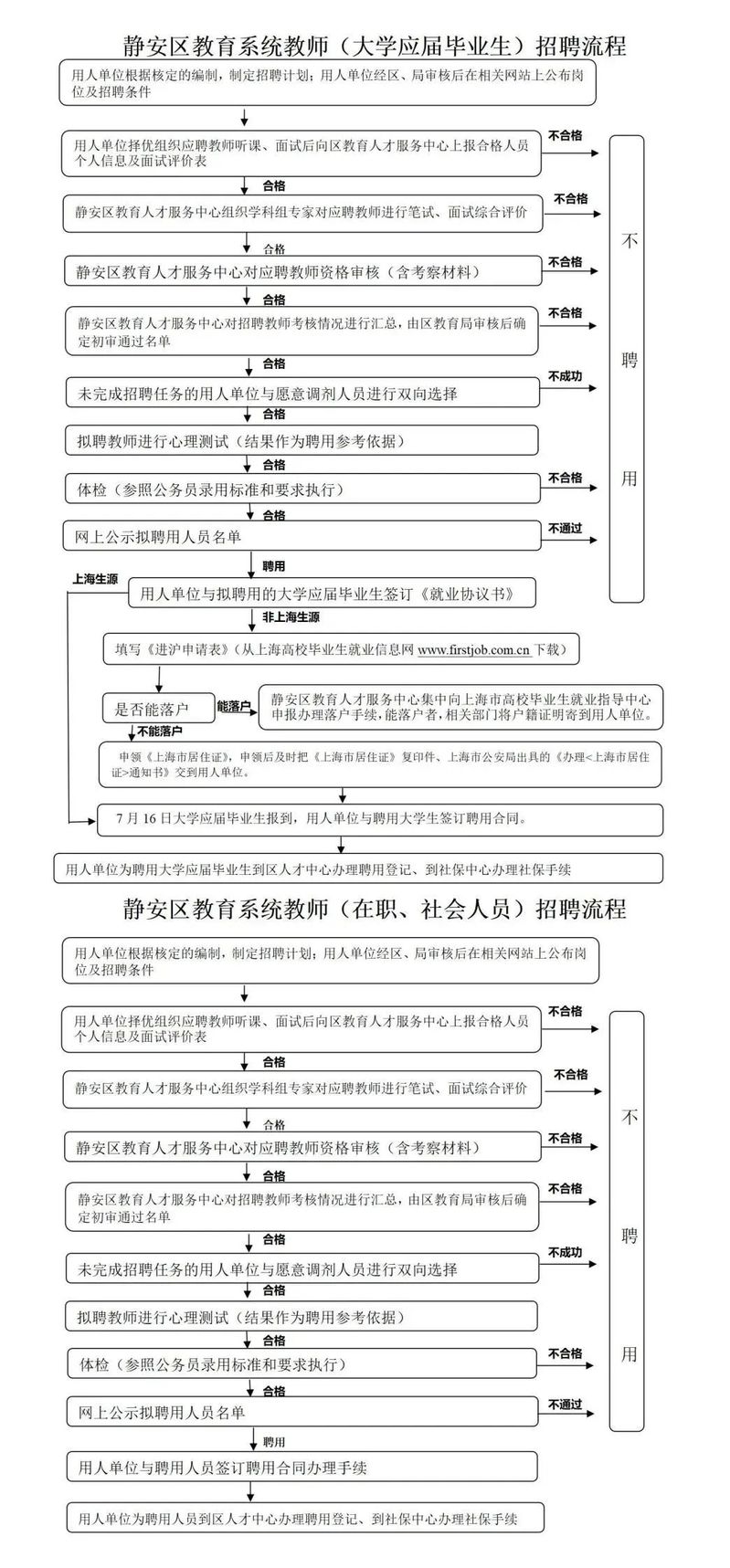 拟聘用教师需进行心理测试。体检、考察工作参照公务员录用标准和要求执行。拟聘用人员名单在“静安门户网站”公示7天,同时公布监督(举报)电话,接受社会监督。
