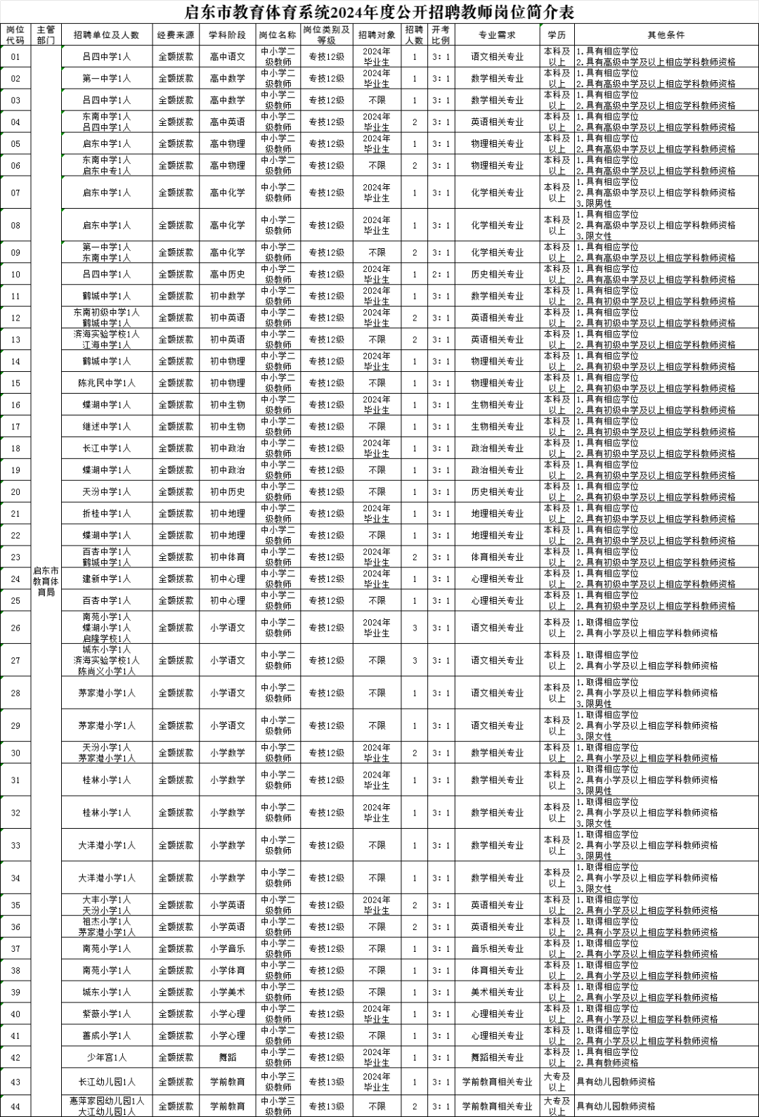 具体招聘岗位、人数及各岗位招聘条件等详见《启东市教育体育系统2024年度公开招聘教师岗位简介表》(见下表,以下简称《岗位简介表》)。