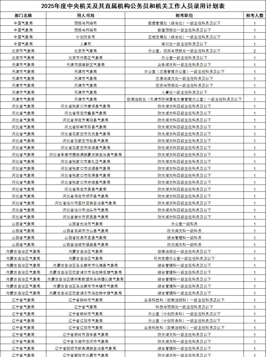 中国气象局及其直属机构计划招录322人。其中,中国气象局机关招录4人,中国气象局系统参照公务员法管理事业单位招录318人。