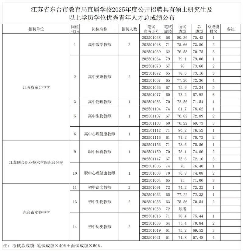 【招聘信息】江苏省东台市教育局直属学校2025年度公开招聘具有硕士研究生及以上学历学位优秀青年人才总成绩公布