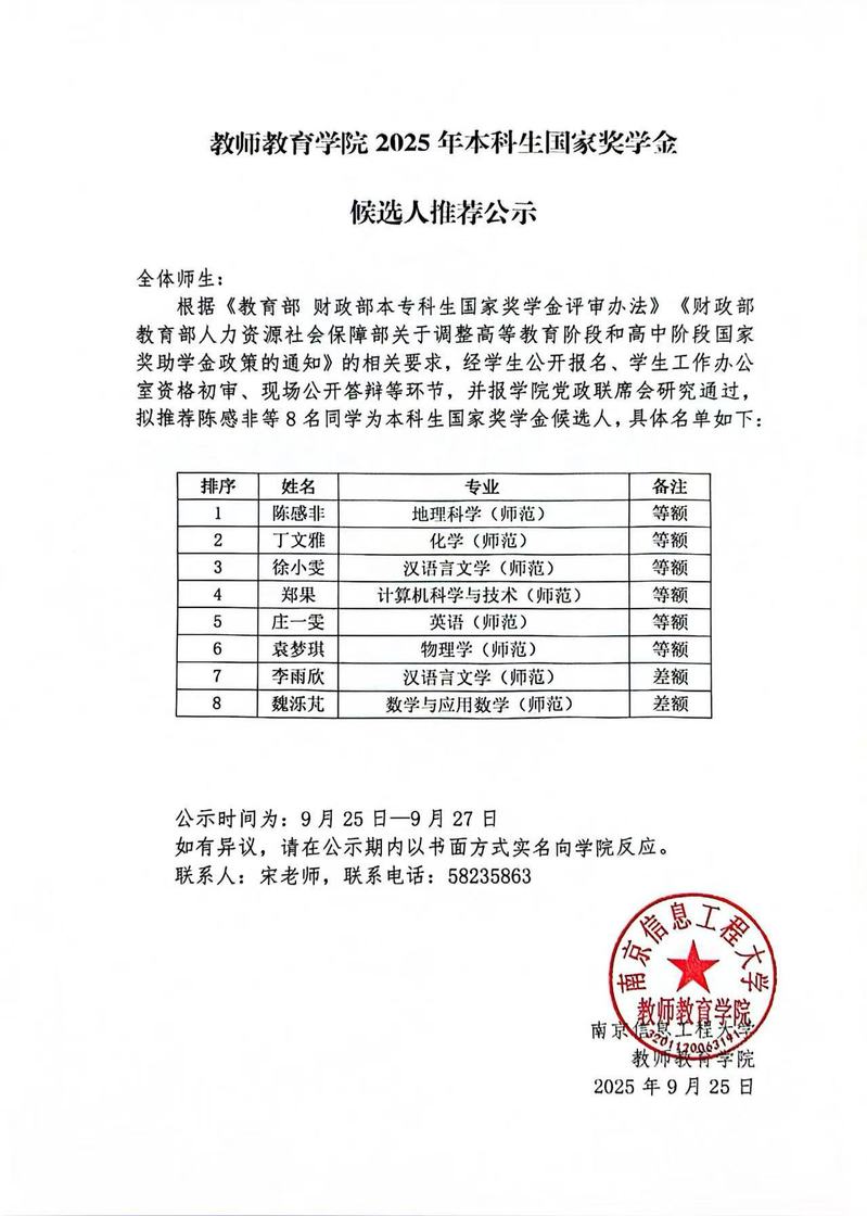 教师教育学院2025年本科生国家奖学金候选人推荐公示