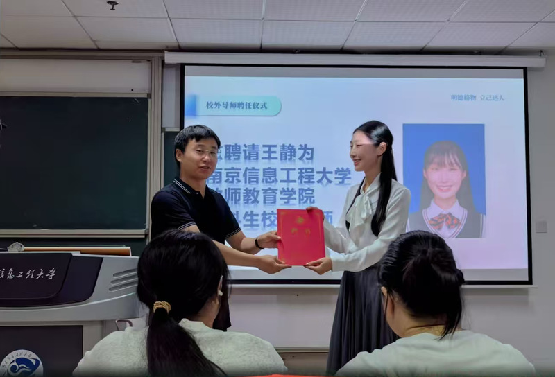 活动伊始,胡冉杰老师代表学院向优秀毕业生王静同学颁发教师教育学院学生就业能力提升导师聘书。