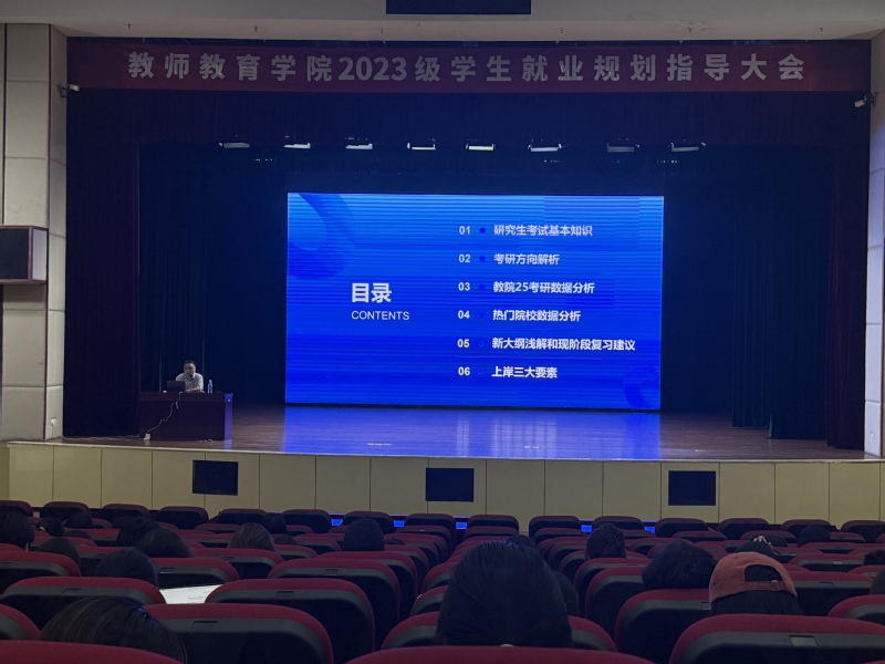 2025年10月12日晚,教师教育学院在大学生活动中心成功召开2023级学生就业规划指导大会。面对当前日益严峻的就业形势,学院把就业动员关口前移至大三学期伊始,通过数据解读、经验传授、策略指导,引导学生早“定目标、稳心态、真行动”,也为学院构建“全过程就业育人”体系夯实基础。2023级全体本科生到场参会。