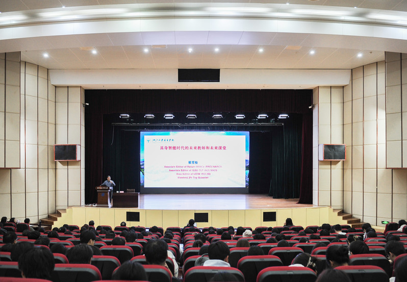 为精准把握人工智能教育应用新趋势,助力师范生与教师队伍构建未来教育核心素养。12月10日下午,教师教育学院第40期“敬学讲堂”系列讲座在大学生活动中心二楼报告厅顺利举办。本次讲座特邀浙江大学教育学院特聘研究员翟雪松作题为“具身智能时代的未来教师与未来课堂”的专题分享,讲座由杨作东院长主持,现场师生共同聚焦AI与教育融合的前沿趋势。