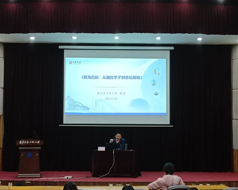 随后,蔡欣校长为同学们介绍“南京市职初教师专业成长资料包”,详细讲解如何在日常教学中提升自身专业成长。他从“站上讲台、站稳讲台、占领讲台、超越讲台”四个阶段,鼓励大家制定职业发展目标,抓住职业发展机遇。他教导大家做好从“学习者”到“教育者+终身学习者”、从“理想主义”到“现实主义下的理想坚守”、从“被关怀者”到“关怀者与责任人”、从“个人奋斗”到“团队协作”四个转变,实现职业发展站上讲台的第一个阶段。
