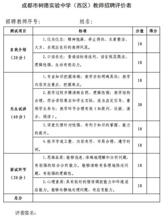 按1:3的比例确定面试人选。由学校领导及教研组组成专家组对参加面试人员进行试讲打分(成都市树德实验中学(西区)教师招聘评价表见附件1)。