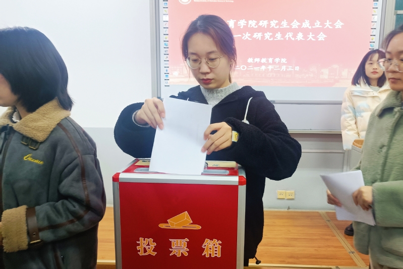 会上,全体与会研究生举手表决,审议通过了《教师教育学院研究生会章程》。研究生辅导员邵芳宣读大会选举办法和大会选举工作人员名单,四位候选人张哲、李慧娟、程一帆、秦岭梅溪依次进行竞选发言,参会的研究生代表进行了无记名现场投票。根据投票结果,张哲、李慧娟、秦岭梅溪三位同学当选为教师教育学院第一届研究生会主席团成员。