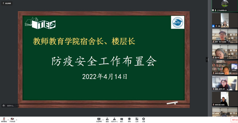 为认真贯彻落实学校疫情防控政策,筑牢学生管理网格,全面做好疫情防控常态化工作,教师教育学院于4月14日晚召开宿舍长、楼层长疫情防控常态化专题工作会。会议采取线上方式进行,学院全体宿舍长、楼层长参加会议,会议由院党总支副书记、副院长王平主持。