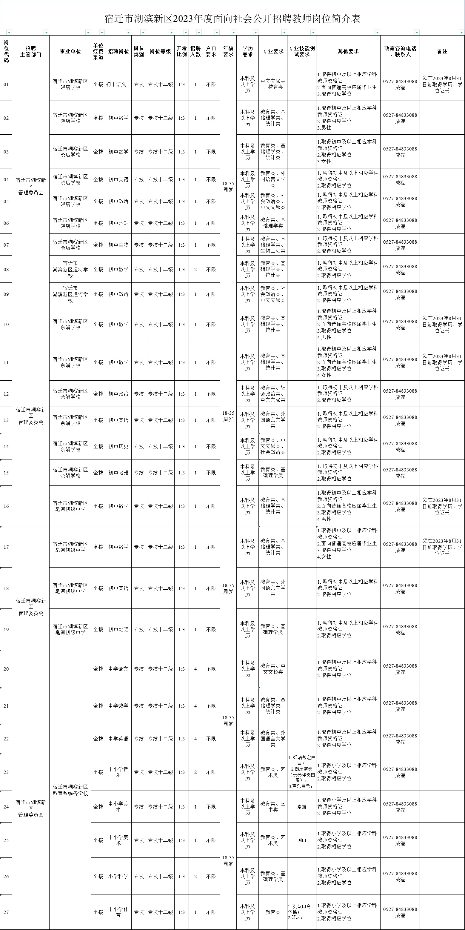 附件:1. 湖滨新区2023年度面向社会公开招聘教师岗位简介表