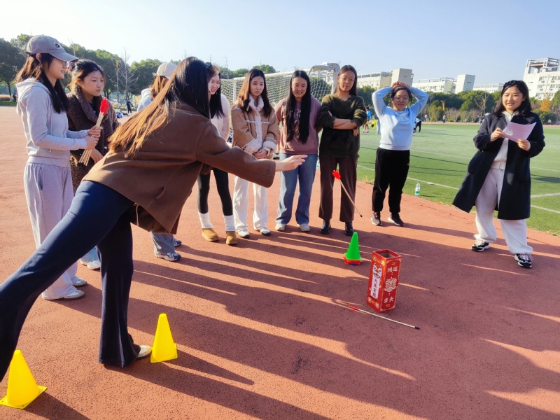“绕锥桶运球”环节中,选手需4人一组按顺序完成运球,从快速穿梭时的节奏把控到接力衔接的无缝配合,既锤炼肢体协调与团队衔接速度,赛后答题环节更强化专业知识能力;“投壶竞技”环节则通过1.5米、2米、3米梯度距离设置,引导选手自主选择投掷策略,在主持人介绍规则后,现场从屏息瞄准到投中欢呼的场景交替上演,既锻炼精准判断与心态调节能力,相互支招的互动更让竞技充满温暖;“乒乓球接力”环节要求每组同学用球拍传递小球,禁止手部触碰且限时2分钟内完成入桶,从调整球拍角度的专注到接力协作的默契,既要求手部控制精度也考验团队节奏把控能力。