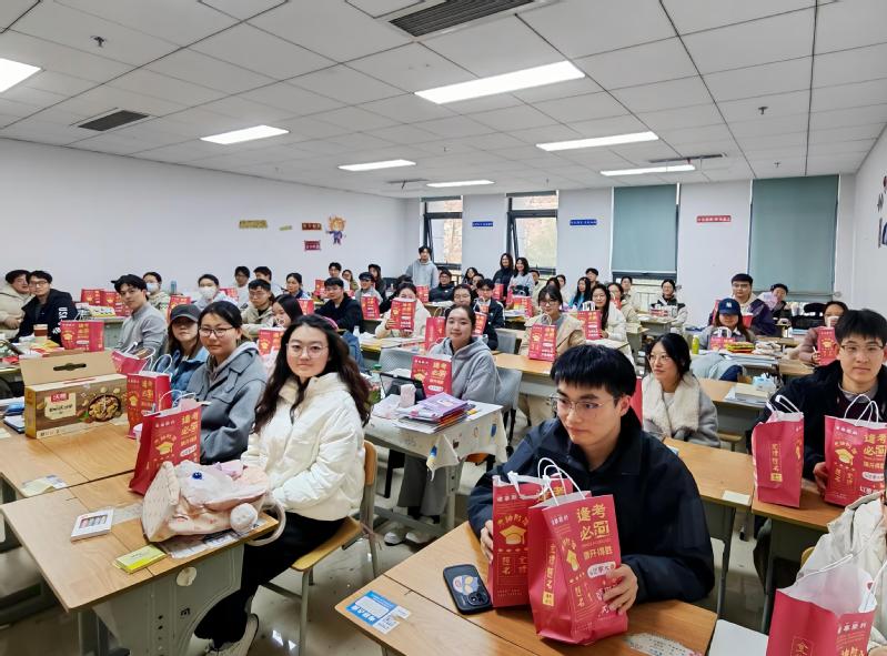 辅导员胡冉杰、董可佩也与同学们进行了交流,了解他们的备考状态与实际需求,并提供了相应的建议与支持。亲切的问候、实用的礼物、殷切的嘱托,让备战考研的学子们倍感温暖与鼓舞。