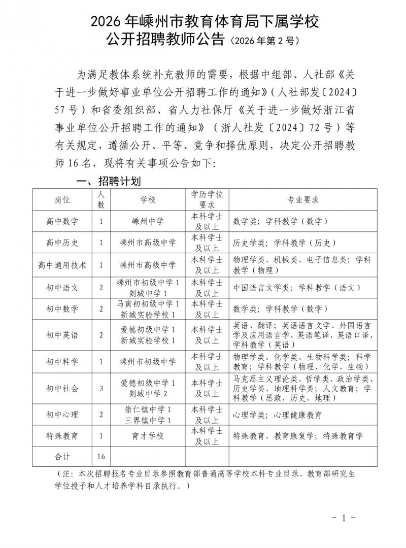 【招聘信息】2026年嵊州市教育体育局下属学校公开招聘教师公告(2026年第2号)